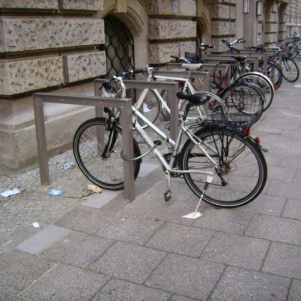 Zur Diebstahlsicherung wird der Fahrradrahmen an den Fahrradständer mittels eines Schlosses angeschlossen.