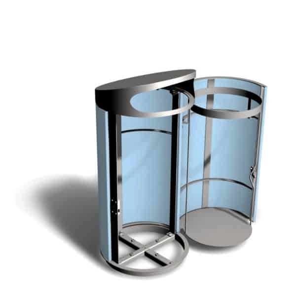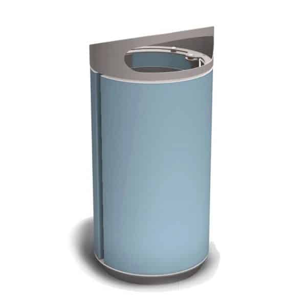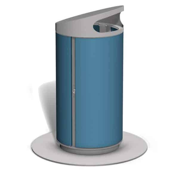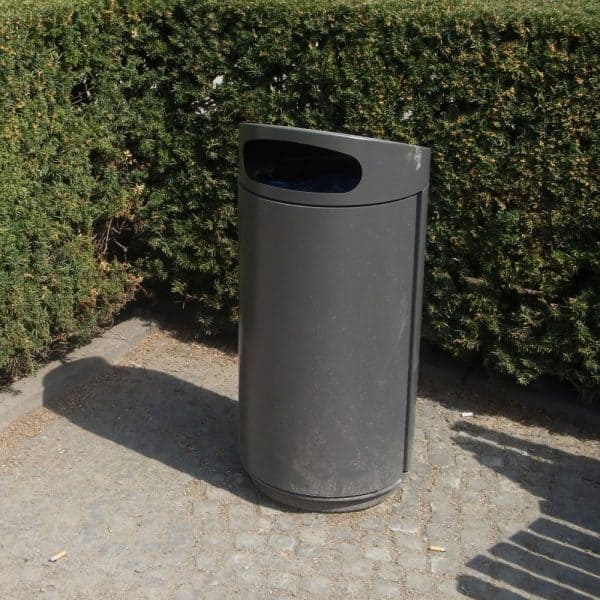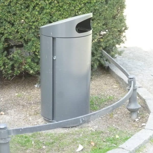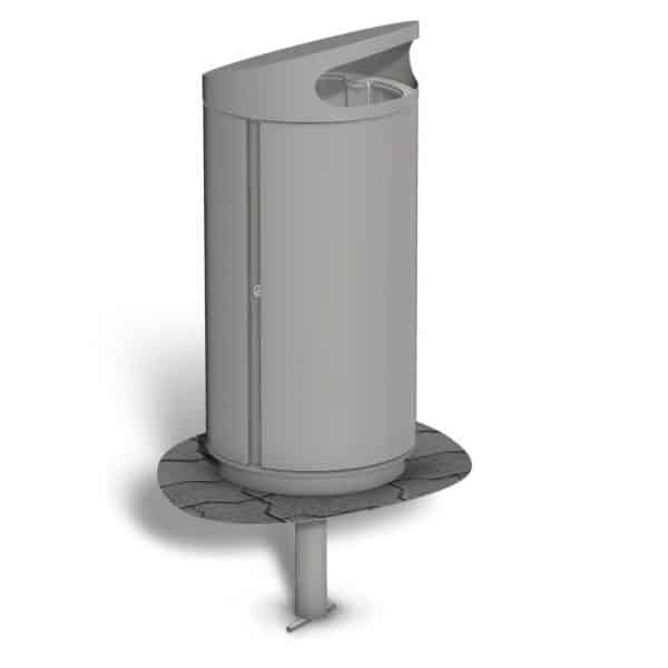 sehr stabiler Abfallbehälter, Einwurfaufsatz schräg abfallend, seitliche Öffnung, große Seitentür zur Entleerung mit integrierter Halterung für Müllsäcke, Innenbehälter oder Ascher optional gegen Aufpreis, Verriegelung über Dreikant-Schnappschloss, Fassungsvermögen 100 Liter