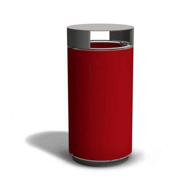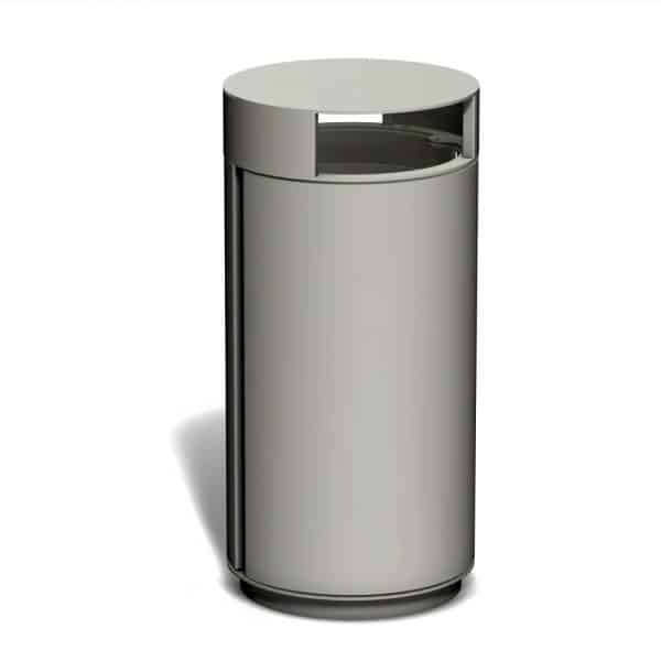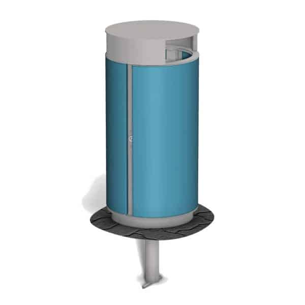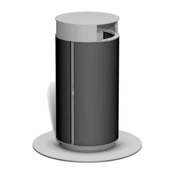 sehr stabiler Abfallbehälter, parallel aufgesetztes Blechdach, rechteckige Einwurföffnung, große Seitentür zur Entleerung mit integrierter Halterung für Müllsäcke, Innenbehälter oder Ascher optional gegen Aufpreis, Verriegelung über Dreikant-Schnappschloss, Fassungsvermögen 100 Liter